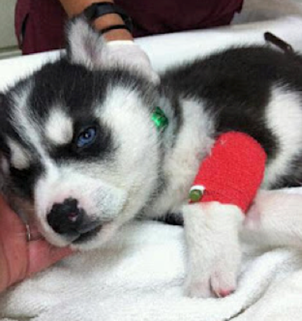 Sundance was an 8 week old husky puppy who was attacked by a pitbull and then left to die at the Baldwin Park shelter. One of the kind staff members contacted us and we took this little guy in. He had several puncture wounds, a fractured jaw and his throat was almost torn out. Even though the estimate for surgery was over $4000 the fundraising began, the chip-ins organized and paws and fingers were crossed.